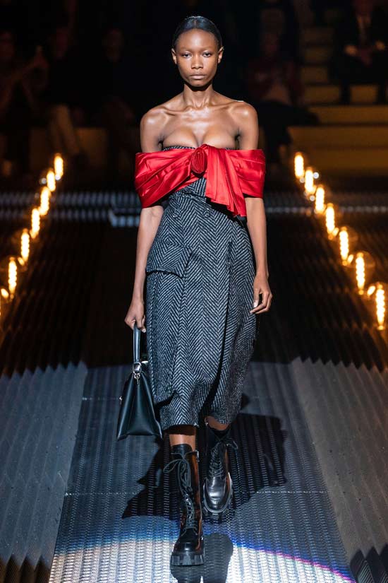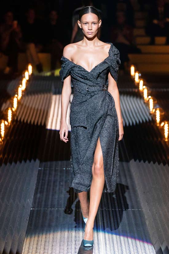 Miuccia Prada 很愛復(fù)古,每一次的設(shè)計都是復(fù)古與現(xiàn)代的結(jié)合?;液谏奔y呢子套裝在加上現(xiàn)代不規(guī)則褶皺或一字肩齊胸設(shè)計,讓整場秀在暗黑低調(diào)中顯露一絲酷女孩的靈巧特質(zhì)。